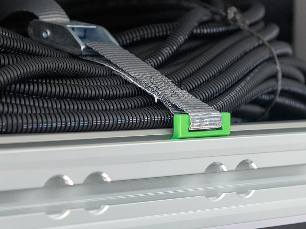 Die bott vario3 Fahrzeugeinrichtung bietet eine nie dagewesene Vielfalt an Möglichkeiten für die Ladungssicherung. Besonders praktisch: das neue C-Lash System. Befestigen Sie Zurrgurte einfach und schnell mit einer Hand an Regalen und Ablagewannen.