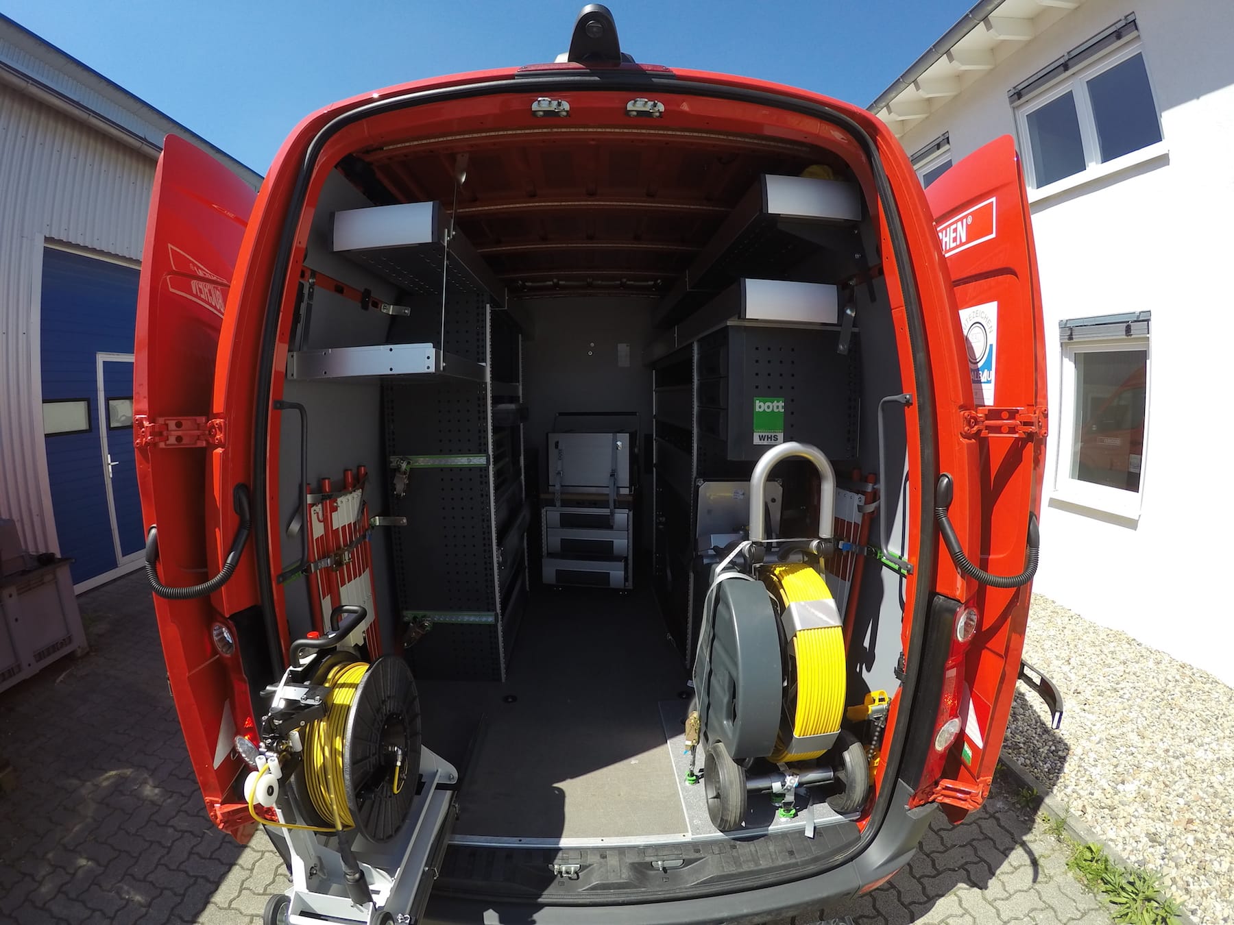 Da der Kunde teures Equipment in seinem VW Crafter transportiert, musste ein passender Platz für dieses geschaffen werden. Auf der linken Seite wurde ein Auszug installiert um die Kabeltrommel aus dem Fahrzeug zu ziehen. Der Kabelwaagen auf der rechten Seite sollte bei Bedarf leicht aus dem Ladenraum geholt werden. Dies haben wir auf kleinstem Raum ermöglicht um noch genügend Platz für das restliche Equipment zu bieten.