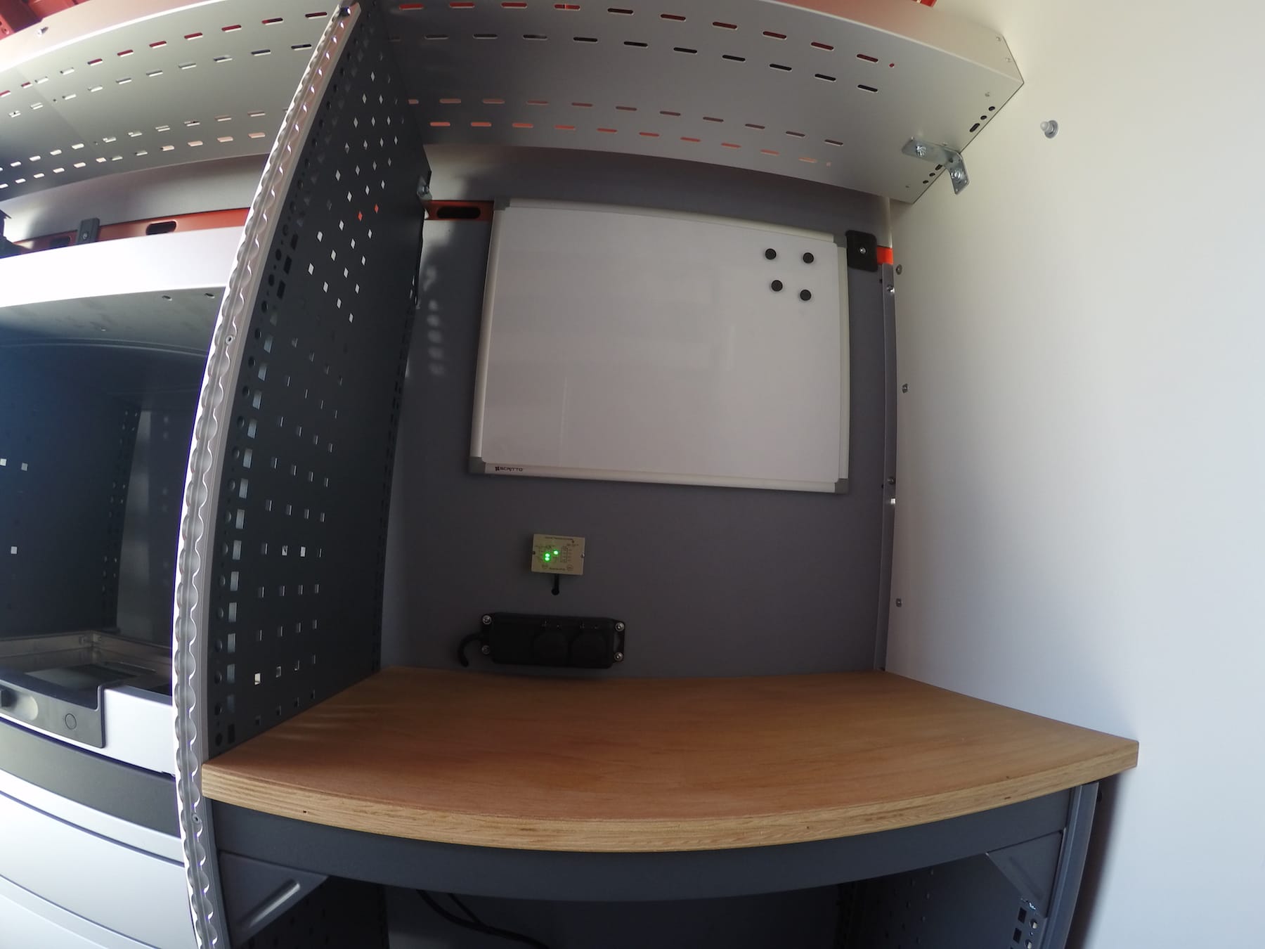 Hier haben wir einem mobilen Arbeitsplatz geschaffen an dem die Mitarbeiter die Auswertungen am Laptop vor Ort abschließen können. Dafür wurde ein Wechselrichter mit Fernbedieung verbaut. Außerdem wurden Steckdosen für den Laptop und andere Geräte verbaut. An dem Whiteboard können wichtige Dokument und Notizen festgehalten werden. Der Wechselrichter wurde unter der Arbeitsplatte montiert um Platz einzusparen.