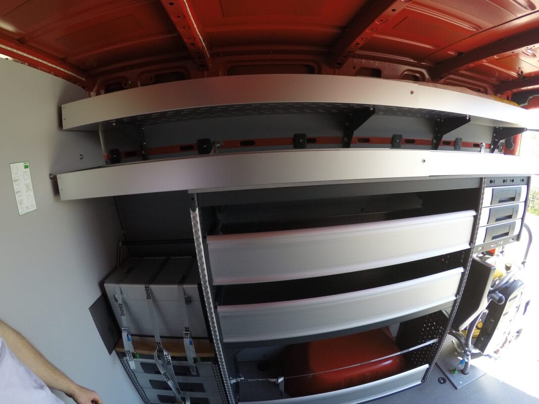 Da der Kunde teures Equipment in seinem VW Crafter transportiert, musste ein passender Platz für dieses geschaffen werden. Auf der linken Seite wurde ein Auszug installiert um die Kabeltrommel aus dem Fahrzeug zu ziehen. Der Kabelwaagen auf der rechten Seite sollte bei Bedarf leicht aus dem Ladenraum geholt werden. Dies haben wir auf kleinstem Raum ermöglicht um noch genügend Platz für das restliche Equipment zu bieten.