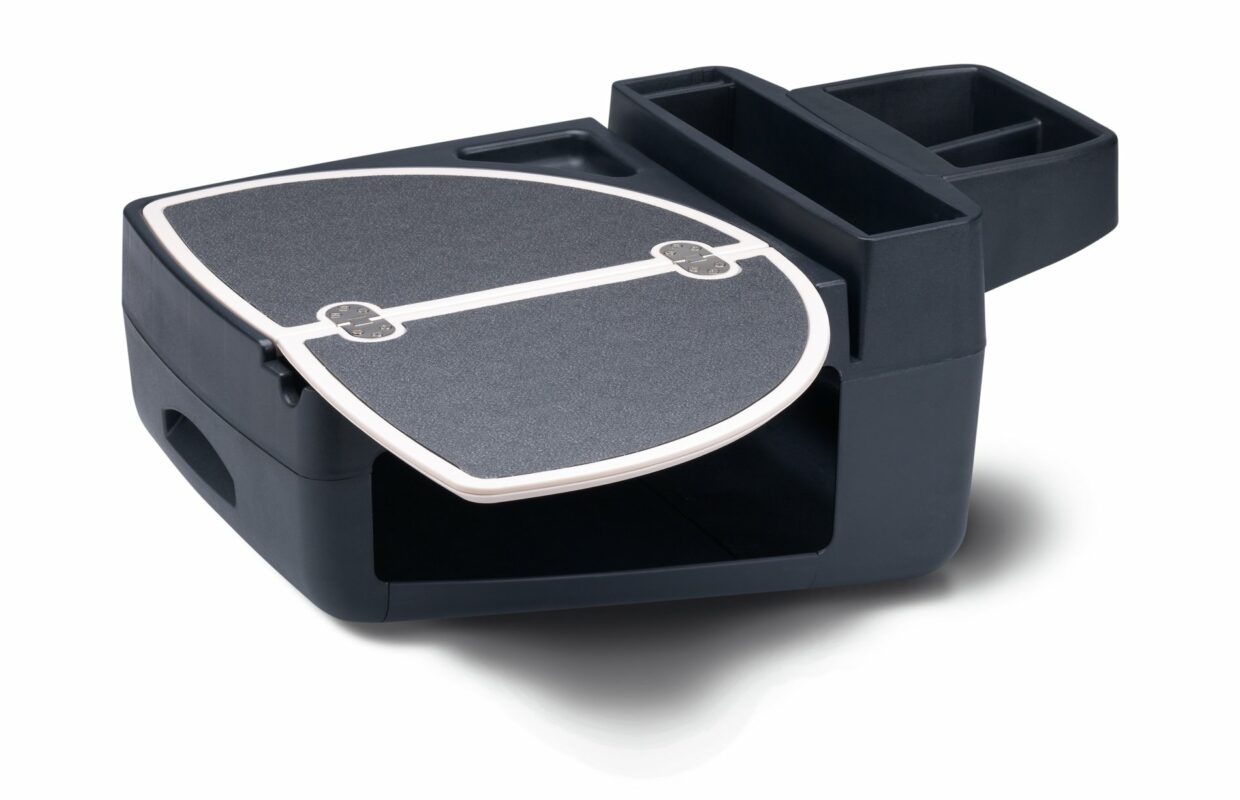 - aufklappbare, rutschfeste Schreibunterlage mit Magnethalter und integriertem Flaschenhalter